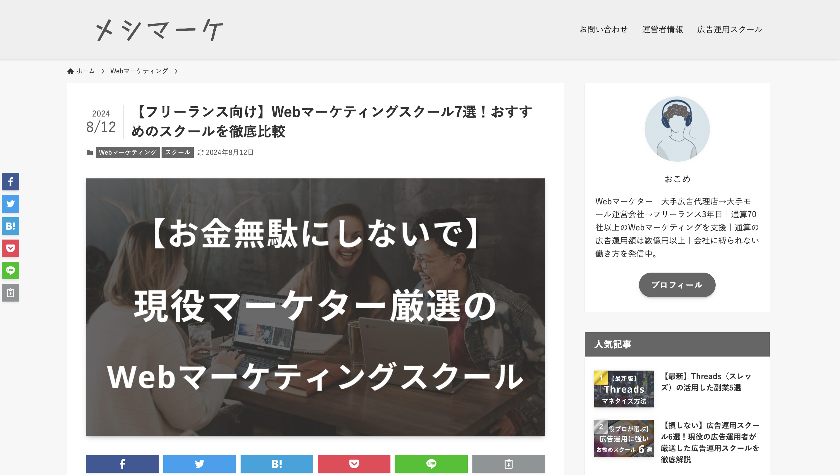 この度、Webマーケティングの学習方法や副業・独立に関する情報を中心に発信している「メシマーケ( https://freelife-marke.com/)」さんに掲載されました!