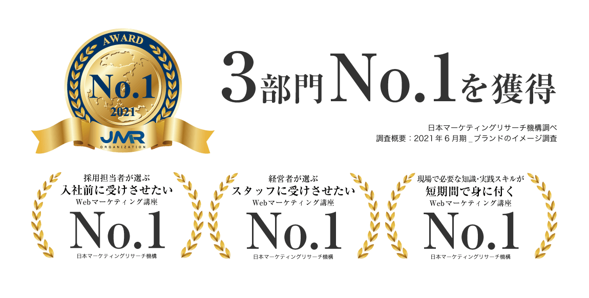 日本マーケティングリサーチ機構が、2021年6月にWebマーケティング講座分野においてのインターネット調査を実施した結果、弊社が運営する「BMP (BREAK MARKETING PROGRAM)」が、『採用担当者が選ぶ 入社前に受けさせたい Webマーケティング講座 No.1』『経営者が選ぶ スタッフに受けさせたい Webマーケティング講座 No.1』『現場で必要な知識・実践スキルが短期間で身に付く Webマーケティング講座 No.1』を獲得しました。