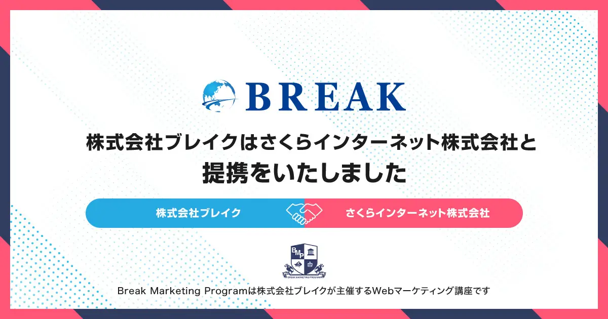 Webマーケティング講座「BMP(ブレイクマーケティングプログラム)」を提供する株式会社ブレイク(本社:大阪府大阪市、代表取締役:小川佳祐、以下、ブレイク)はこの度、デジタルインフラサービスを提供するさくらインターネット株式会社と提携を開始いたしました。本提携により、受講生の皆さまに、より実践的で価値の高い学習体験を提供できるようになります。